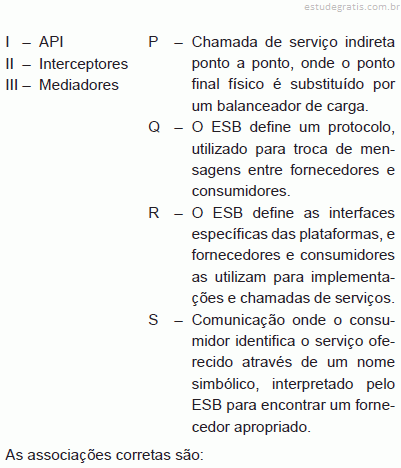 Em Arquiteturas Orientadas a Serviços, os barramentos de serviços corporativos (ESB - Enterprise Service Bus) viabilizam a infraestrutura que permite usar os serviços em ambientes distribuídos. Entretanto, os ESB possuem características técnicas e conceituais que os distinguem, e, em função dessas diferenças, podem ser categorizados. Associe os tipos de conexão com suas possíveis implementações.