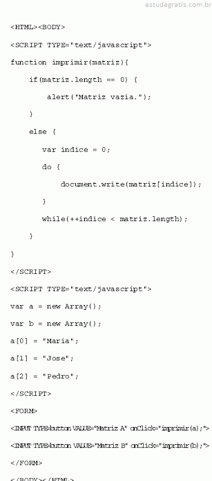 Considerando o seguinte trecho de código, é correto afirmar que: não há erros de sintaxe no código; ao se pressionar um dos botões, será apresentado um alerta informando que a matriz b está vazia; quando pressionado o outro botão, serão apresentados os elementos da matriz a.