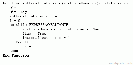Um administrador está desenvolvendo uma função em VBS que permita localizar a primeira ocorrência de um usuário em uma lista de usuários. A listagem a seguir apresenta uma versão incompleta da função.
