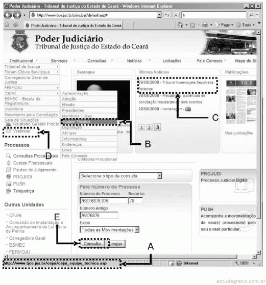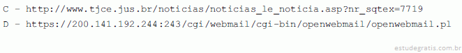 A figura acima apresenta o aspecto visual gerado por um browser a partir de visita ao sítio www.tjce.jus.br. Na figura, foram destacadas regiões nomeadas por A, B, C, D e E. No momento da captura da tela, o ponteiro do mouse encontrava-se sobre a região B. Quando o usuário passou o ponteiro do mouse pelas regiões C e D, as informações apresentadas na região A foram, respectivamente, as indicadas abaixo: