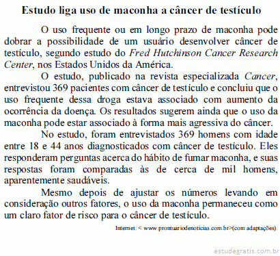 O estudo descrito avaliou a incidência de câncer de testículo entre homens com idade entre 18 e 44 anos de idade e usuários de maconha.
