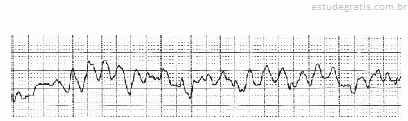 Um médico foi chamado à recepção, ao lado do seu consultório, para atender um senhor de 52 anos de idade, que, enquanto aguardava para ser atendido, teve perda súbita da consciência e caiu na sala de espera. Imediatamente, o médico solicitou ajuda, constatou inconsciência e ausência de respiração e pulso. Simultaneamente, a auxiliar de enfermagem trouxe rapidamente um desfibrilador externo manual monofásico, cujo monitor revelou o traçado mostrado abaixo. A secretária disse que o paciente estava agendado para homologação de atestado médico devido a internação recente por infarto do miocárdio.