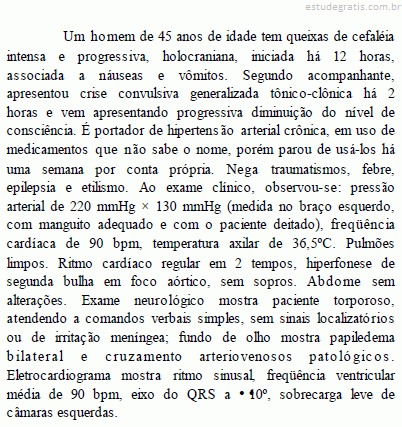 A terapia medicamentosa, nesse caso clínico, deve objetivar uma rápida e máxima redução da pressão arterial. De uma maneira geral, deve-se promover uma redução inicial de cerca de 40% e depois manter a pressão arterial em valores iguais ou menores do que 140 mmHg × 90 mmHg.