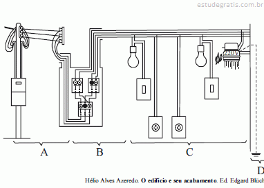 O desenho acima apresenta uma instalação elétrica normal de uma casa. Com relação aos trechos indicados pelas letras A, B, C e D nesse desenho, julgue os itens a seguir.