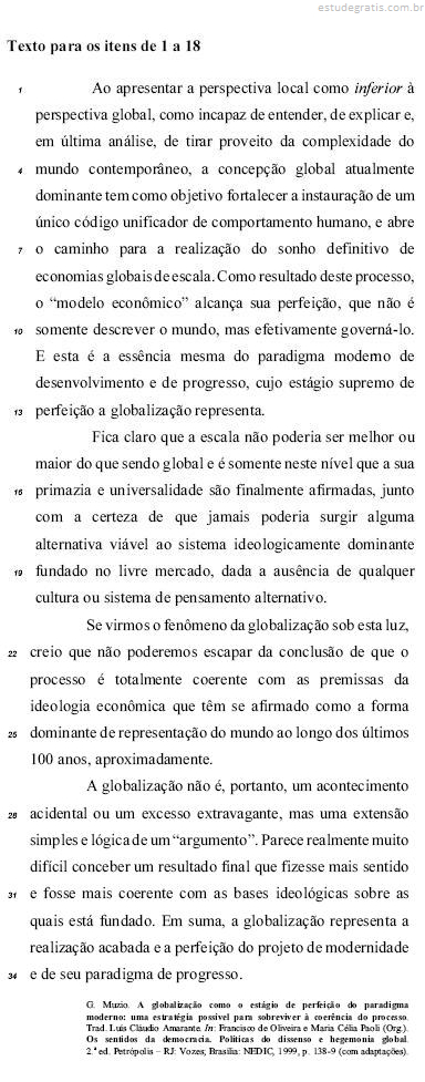 No texto, é apresentada, em forma dissertativa, uma análise do processo de globalização e da hegemonia, no mundo contemporâneo, do sistema econômico embasado no livre mercado.