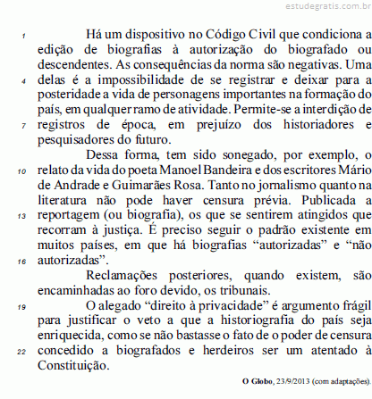 Depreende-se das ideias apresentadas no texto que a Constituição dispõe que é direito de todos os cidadãos censurar e impedir a circulação de informações a respeito da própria vida.Comentários