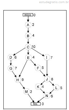 A figura acima mostra uma rede PERT-CPM associada a um processo produtivo. Nela, os círculos indicados por letras representam as diversas atividades do processo, os números adjacentes aos círculos representam os tempos de duração, em horas, das respectivas atividades, e as setas representam as relações de precedência. Acerca dessa rede, julgue os seguintes itens.