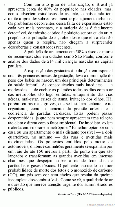 9 a 21.Na linha 15, o emprego de sinal indicativo de crase em "à poluição" deve-se à regência da palavra "exposição", que exige preposição, e à presença de artigo definido feminino no singular.