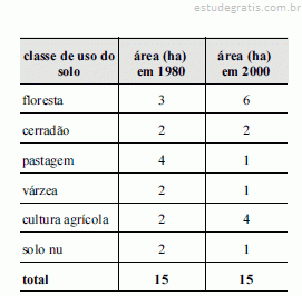 Um estudo foi realizado para avaliar a adequação do uso do solo com vistas ao planejamento socioambiental de uma microbacia localizada em determinado município brasileiro. A tabela abaixo mostra o uso do solo em 1980 e em 2000, segundo as classes de ocupação.