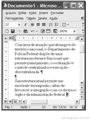 Considerando a figura acima, que ilustra uma janela do Word 2000 com parte de um texto extraído e adaptado do sítio http://www.dpf.gov.br, julgue os itens subseqüentes.