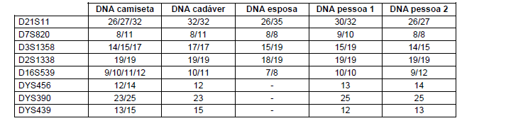 Em uma cena de encontro de cadáver, constatou-se que a camiseta da vítima apresentava duas manchas de cor avermelhada. A perícia de local coletou amostra das duas manchas e o Instituto Médico Legal coletou amostra de sangue periférico do cadáver, da esposa do de cujus e de duas pessoas que foram vistas próximas à cena. Foi realizada análise de polimorfismos de DNA tipo STR autossômicos e do cromossomo Y nas manchas da camiseta, conforme descrito na tabela abaixo.