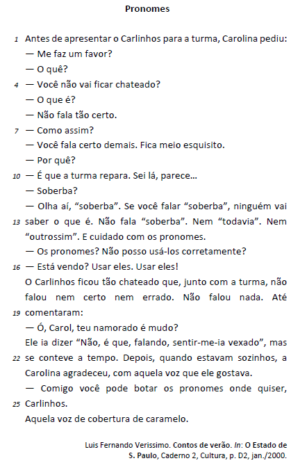 Nas linhas de 12 a 14, Carolina pede que Carlinhos não empregue certos vocábulos da língua portuguesa porque esses são considerados como arcaicos pela gramática normativa da língua.Comentários