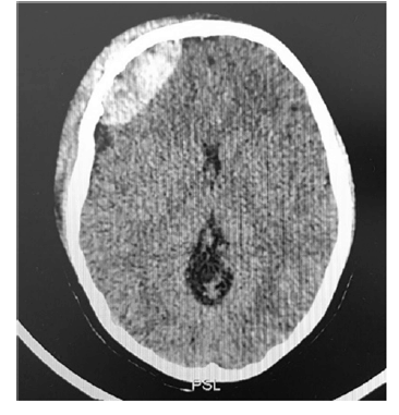 Um menino de dez anos de idade, vítima de trauma cranioencefálico, foi levado ao hospital pelo resgate após queda do telhado de uma altura de 5 m. Deu entrada na emergência com Glasgow de 13, evoluindo com crise convulsiva, tratada adequadamente com medicação. Foi realizada, ainda, uma tomografia de crânio que apresentou a imagem seguinte.