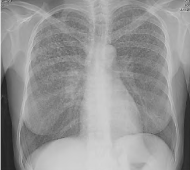 Uma paciente de 45 anos de idade compareceu, acompanhada pela filha, a uma consulta ambulatorial. Queixa-se de perda de peso (em torno de 4 kg nos últimos seis meses), febre vespertina e fadiga há mais de 20 dias. Observe que tem trabalhado muito, tem uma fadiga crônica e acha que iniciado os sintomas após exposição à chuva e o frio quando voltava do trabalho para casa. Ela informa que é etilista social e tabagista (15 cigarros / dia), e alguns exames laboratoriais como hemograma, eletrólitos, função hepática e renais normais. Os raios X de tórax estão representados na imagem a seguir. O resultado do PPD e o lavado brônquico são negativos.