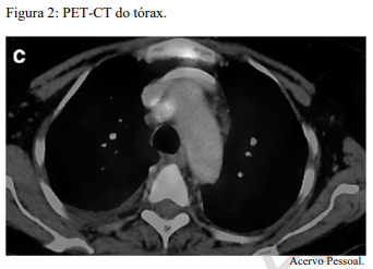 Um paciente de 62 anos de idade, tabagista ativo, cerca de 180 anos-maço, queixa-se de cansaço, tosse seca e perda de peso; por isso, procurou atendimento médico. O paciente referiu que pesava 100 kg e perdeu 10 kg. Realizou-se tomografia computadorizada de tórax, com evidência de lesão sólida de 2,1 cm em topografia de lobo inferior à direita, sólida, espiculada, com margens bem definidas e densidade de partes moles, assim como linfonodomegalia paratraqueal direita de 1,5 cm, paratraqueal esquerda de 1,2 cm e subcarinal de 2 cm. O paciente foi submetido a PET-CT de corpo inteiro, com evidência de hipercaptação de radiofármaco pela lesão (SUV 12) e eplo linfonodo representado na figura 2 a seguir.