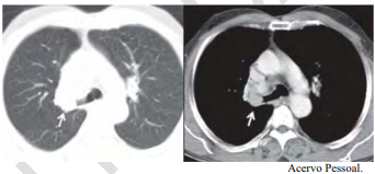 Uma paciente de 47 anos de idade, não tabagista, apresenta episódio de tosse e hemoptise. A tomografia computadorizada de tórax, realizada para investigação, evidenciou um nódulo pulmonar, com densidade de partes moles, de 2,1 cm, com obstrução do brônquio lobar superior direito, demonstrada nas imagens a seguir. Não há linfonodos mediastinais aumentados. A fibrobroncoscopia para investigação evidenciou uma lesão sólida em brônquio lobar superior direito, com obstrução total do brônquio, e aspecto em dedo de luva. As tomografias computadorizadas de abdome e de crânio não identificaram lesões metastáticas a distância. A biópsia endobrônquica demonstrou ser um carcinoide típico.