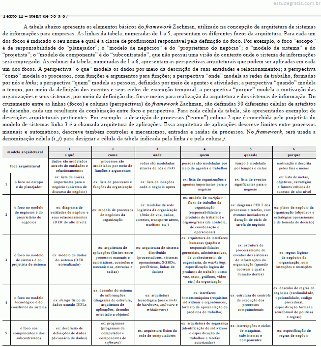 Relacionando características do framework Zachman, apresentado no texto II, julgue os itens a seguir, relativos a técnicas de reunião, entrevista e análise de sistemas de informação.