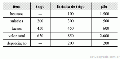 No país Y, há apenas três empresas: uma produz trigo, outra produz farinha de trigo, e a terceira produz pão. Toda a produção de trigo e de farinha é comprada pela fábrica de pão. A produtora de trigo não compra insumos (matérias-primas), e a produtora de farinha de trigo compra seus insumos de outro país. A tabela abaixo apresenta, em unidades monetárias, os valores da produção.