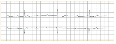 Paciente de 70 anos, feminina, sem fatores de risco para doença coronariana, procura ambulatório de cardiologia após sincope verdadeira. Seu eletrocardiograma (DI e V1 longo) é mostrado abaixo.