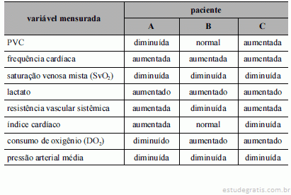 Considerando as informações da tabela acima, que apresenta o resultado dos parâmetros medidos dos pacientes A, B e C, internados em estado crítico em uma unidade de terapia intensiva (UTI) com monitorização hemodinâmica invasiva, julgue os itens subsequentes.