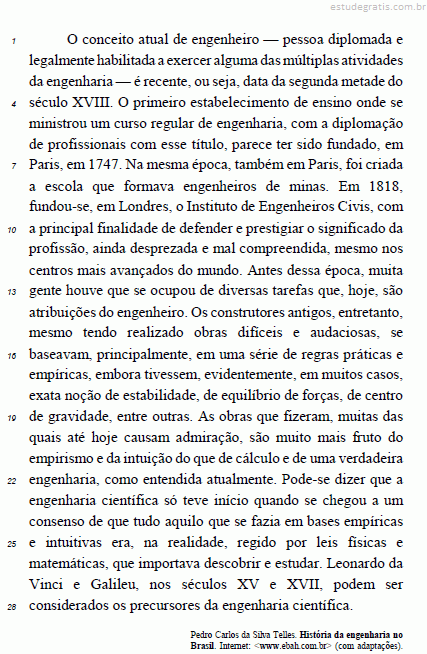 Depreende-se da leitura do texto que o autor, relevando os critérios com que a “engenharia científica” (l.23) foi definida, aproxima as atividades exercidas por “construtores antigos” (l.14) das realizadas com base em leis da física e da matemática.