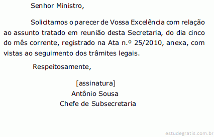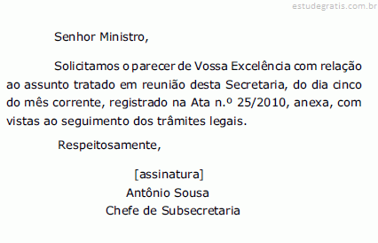 No lugar de “Ministro”, poderia ser utilizado o nome completo do receptor da comunicação, uma vez que seu cargo já teria sido incluído no destinatário do documento, que é parte inicial obrigatória de expedientes oficiais.