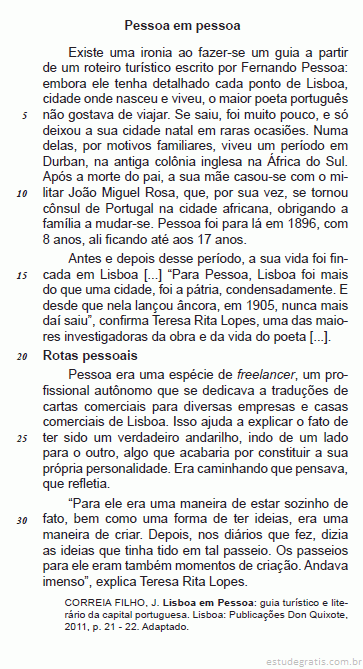 No trecho “Depois, nos diários que fez, dizia as ideias que tinha tido em tal passeio. Os passeios para ele eram também momentos de criação.” (l. 31-33) a junção dos períodos em apenas um mantém o sentido original e está adequada à norma-padrão em: