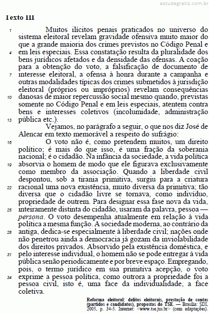 Cada um dos itens a seguir apresenta uma proposta de reescrita de trecho do texto III — indicado entre aspas —, que deve ser julgada certa se estiver gramaticalmente correta e mantiver o sentido do texto, ou errada, em caso contrário.
