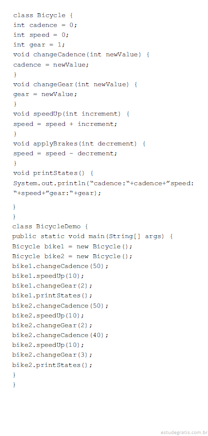 Ao final da execução desse trecho de programa, serão impressos os seguintes valores para bike2. cadence:50 speed:20 gear:3